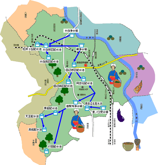 京田辺市の水道水源には地下水と京都府営水道からの浄水受水の二つがあります。水道水は次の4つの浄水場系統に分かれて市内に給水されています。