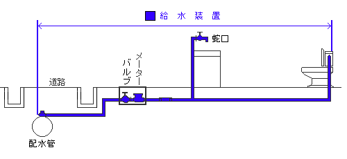 上下水道部が布設した配水管から分岐して、蛇口までの給水管と、それに直結している給水用具を給水装置といいます。