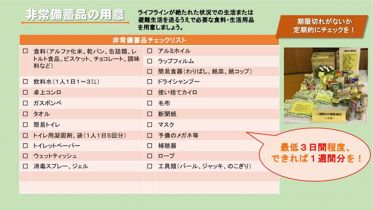 被災後の生活に備えて、各家庭で最低3日分、できれば1週間分の食料や飲料水の備蓄に努めましょう。
