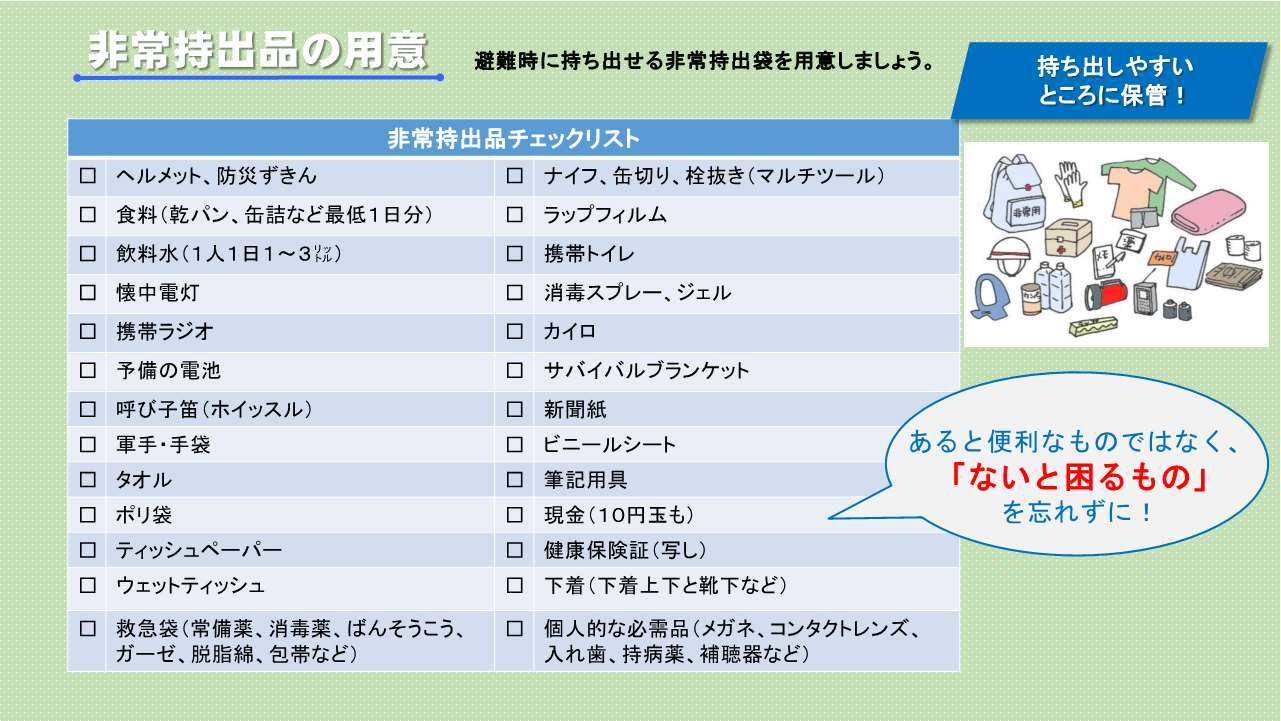 非常持出品……避難所などに避難するときに持ち出す備蓄品