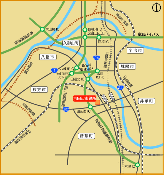 国道1号線の京滋バイパス久御山インターチェンジ交差を左折し、京滋バイパス側道へ。国道24号線交差点で右折し、京奈和自動車道路の城陽インターチェンジから田辺西インターチェンジへ。国道307号を東へ。田辺西インターチェンジから約10分