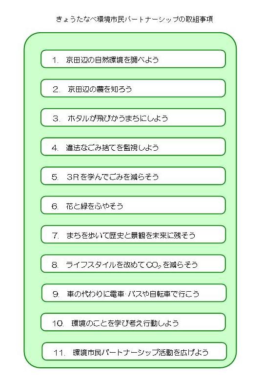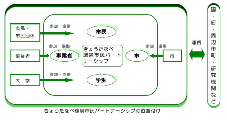 京田辺市環境基本計画を推進するため、市民、学生、事業者および市が連携・協働して、環境の保全と創造に向けて取り組むことにより、良好な地域の環境の確保と地球環境保全に貢献し、「市民の環で環境を守り育てるまち 京田辺」の実現に寄与すること。