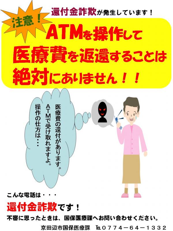 市役所職員を名乗って、「医療費や保険料の還付金があるので、手続きをして欲しい。」などと電話をかけて、銀行やコンビニのATMに誘い出すという還付金詐欺が発生しています。