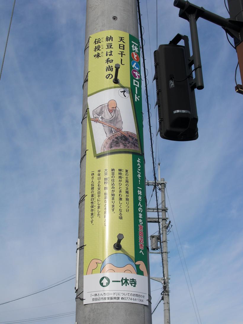 【内容】 市民のみなさんがまちの歴史を再認識し、京田辺市に愛着を持つことができるようにするため、また、来訪者が一休寺までの道中を楽しみながら歩くことができ、京田辺市を訪れてよかったと思えるようにするために、区間内15カ所の電柱に、一休禅師生誕600年を記念して製作された「一休かるた」を使った22種類の案内板を取り付けました。