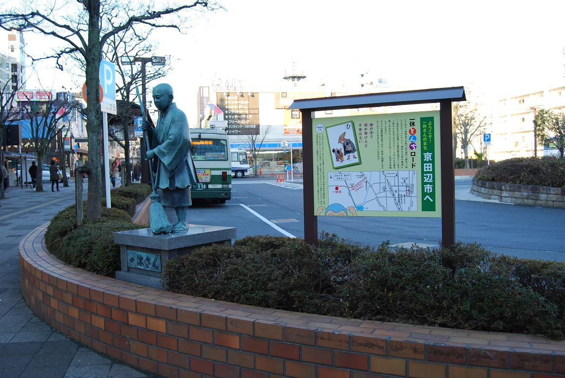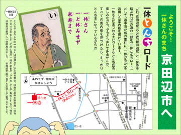 近鉄新田辺駅西口の一休像横、JR京田辺駅西口の一休像横、一休寺山門横に一休とんちロードを紹介する看板を設置しています。