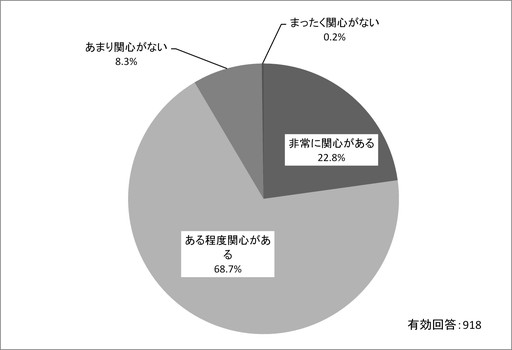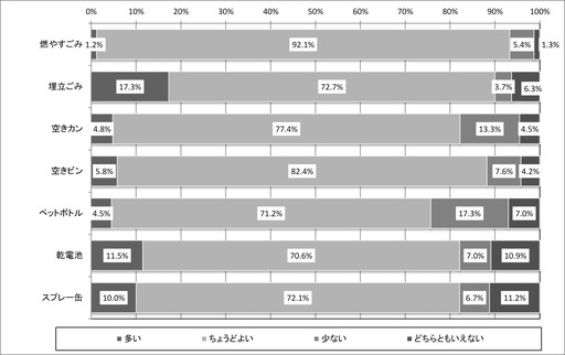ごみ問題について、本市では91.5%の人が、関心がある("非常に"と"ある程度"の合計)と回答しており、平成21年度に内閣府が調査した結果(92.5%)に比べて若干少ないものの、関心が高いことが伺えました。