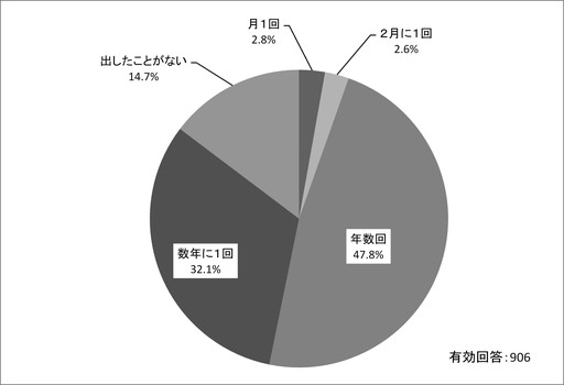 粗大ごみの収集頻度については、「年数回」という回答が47.7%で一番多く、「数年に1回」が32.1%、「出したことがない」が14.8%となっており、この3つで全体の95%となっています。