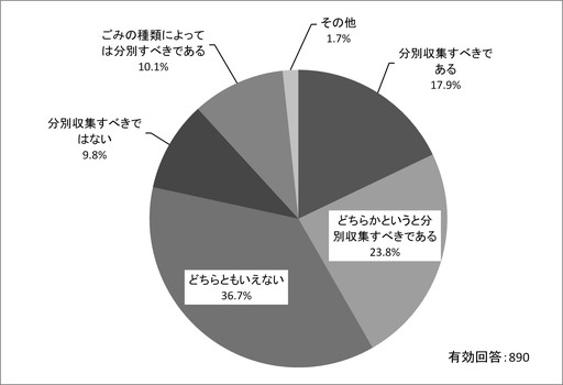 紙類、衣類・布類およびプラスチック製容器包装など、分別区分を新たに増やして、資源ごみを分別収集することについては、「分別すべき」という意見が41.7%、「どちらともいえない」が36.7%、「分別すべきでない」が9.8%となっています。