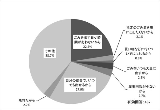 ごみを持ち込む理由は、「自分の都合で、いつでも出せるから」と、「ごみを出す日や時間があわないから」という理由が大きいことがわかりました。また、年末年始や引っ越し等による一時多量ごみの処理のため持ち込まれた方もいらっしゃるようです。