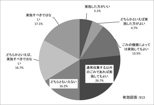 ごみの有料化について、「実施したほうがいい」「通常収集する以外のごみであれば実施してもよい」など、なんらかのかたちで有料化してもよいという意見が合計で50%ともっとも多くあつまりました。一方で、「実施すべきでない」という意見は33.8%となりました。