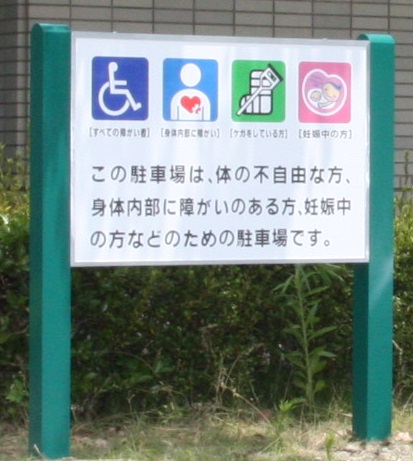 市は、市役所など11公共施設の車いすマーク駐車場に、「おもいやりマーク」看板を設置しています。