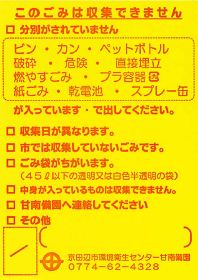 ごみが分別されていないと、そのごみは収集しないで、正しいごみの出し方を記入した警告シール(イエローシール)を貼り付けておきます。