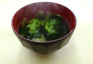 - 鍋に分量のだし汁とうすくちしょうゆを入れ、沸騰したらわかめを入れ、最後にレタスを入れる。