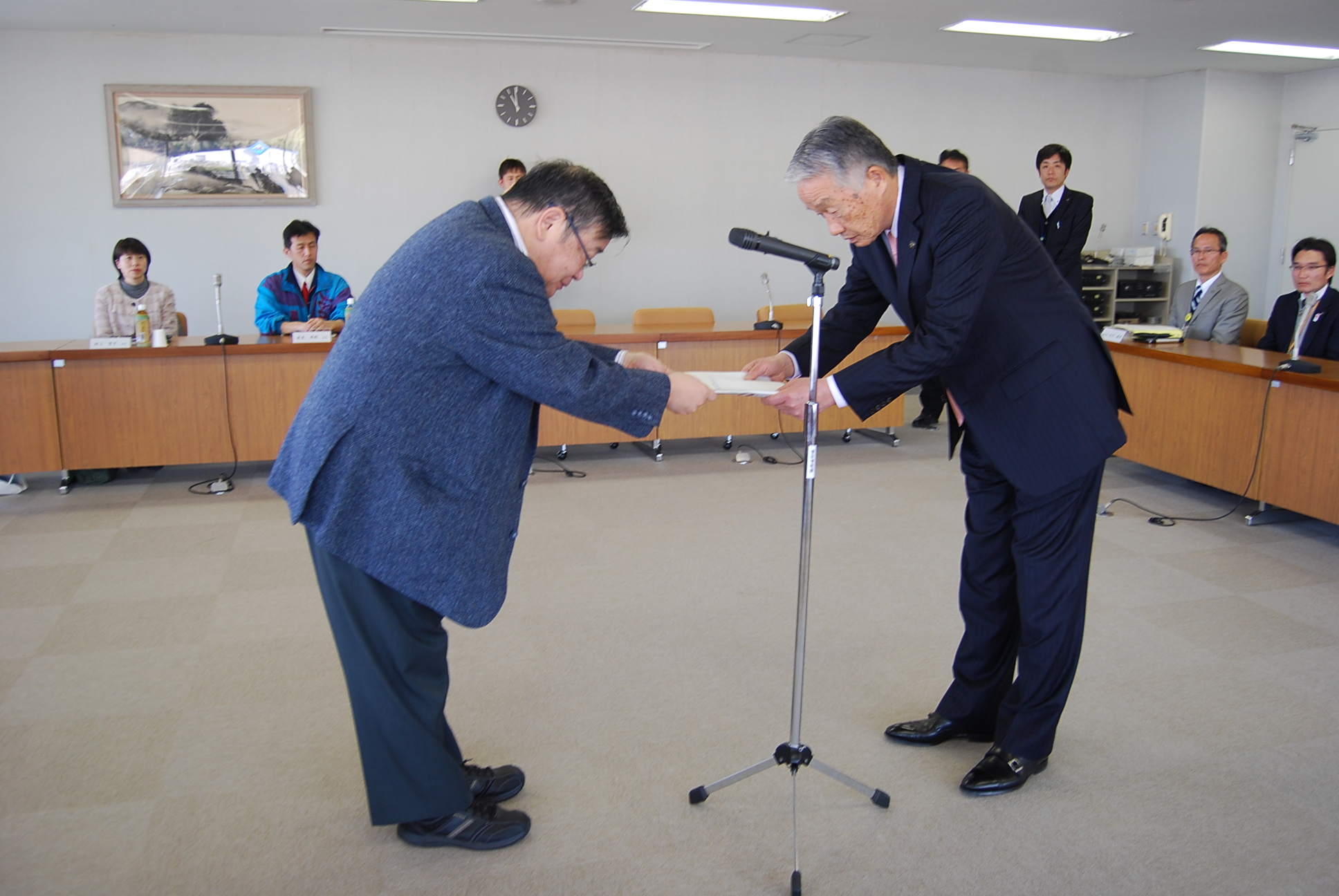 最終案について、委員会で大きな修正がなかったため、引き続き、郡嶌委員長から石井市長へ答申の手交が行われました。