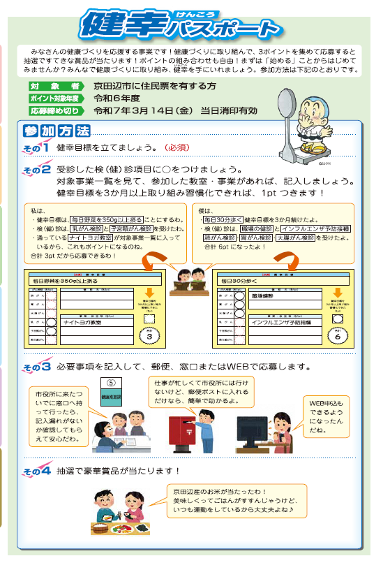 健幸パスポート事業とは、みなさんの健康づくりを応援する事業です!健康づくりに取り組んで、ポイントを集めると抽選ですてきな賞品が当たります!ポイントの組み合わせも自由!