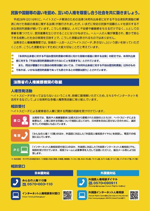 「本邦外出身者に対する不当な差別的言動の解消に向けた取組の推進に関する法律」が成立し、平成28年6月3日(金)に施行されました。