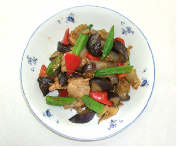- フライパンに油を入れ、強火でしょうが、豚もも肉を炒める。火が通ったらたまねぎ、たけのこ、パプリカ、なすを入れて炒める。