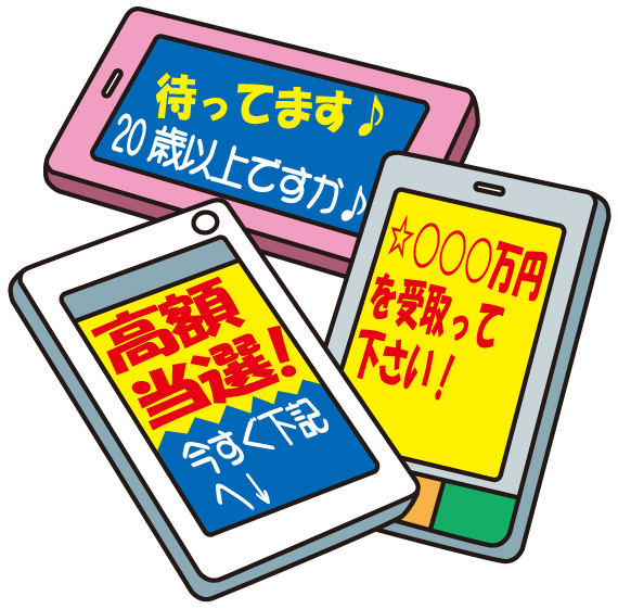 ☆大金を簡単にもらえる、有名芸能人と友達になれるなど、うまい話はありません。知らない人から届くメールには返信しない、信用しないことが大切です。