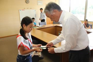 秘書から名刺の交換の仕方をレクチャーしてもらい、石井市長や鞍掛副市長と名刺交換を実践