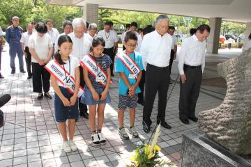 コミュニティホールで開催中の「平和展」を見学したのち、庁舎玄関にある「平和の塔」前で、平和祈念黙とうを行いました