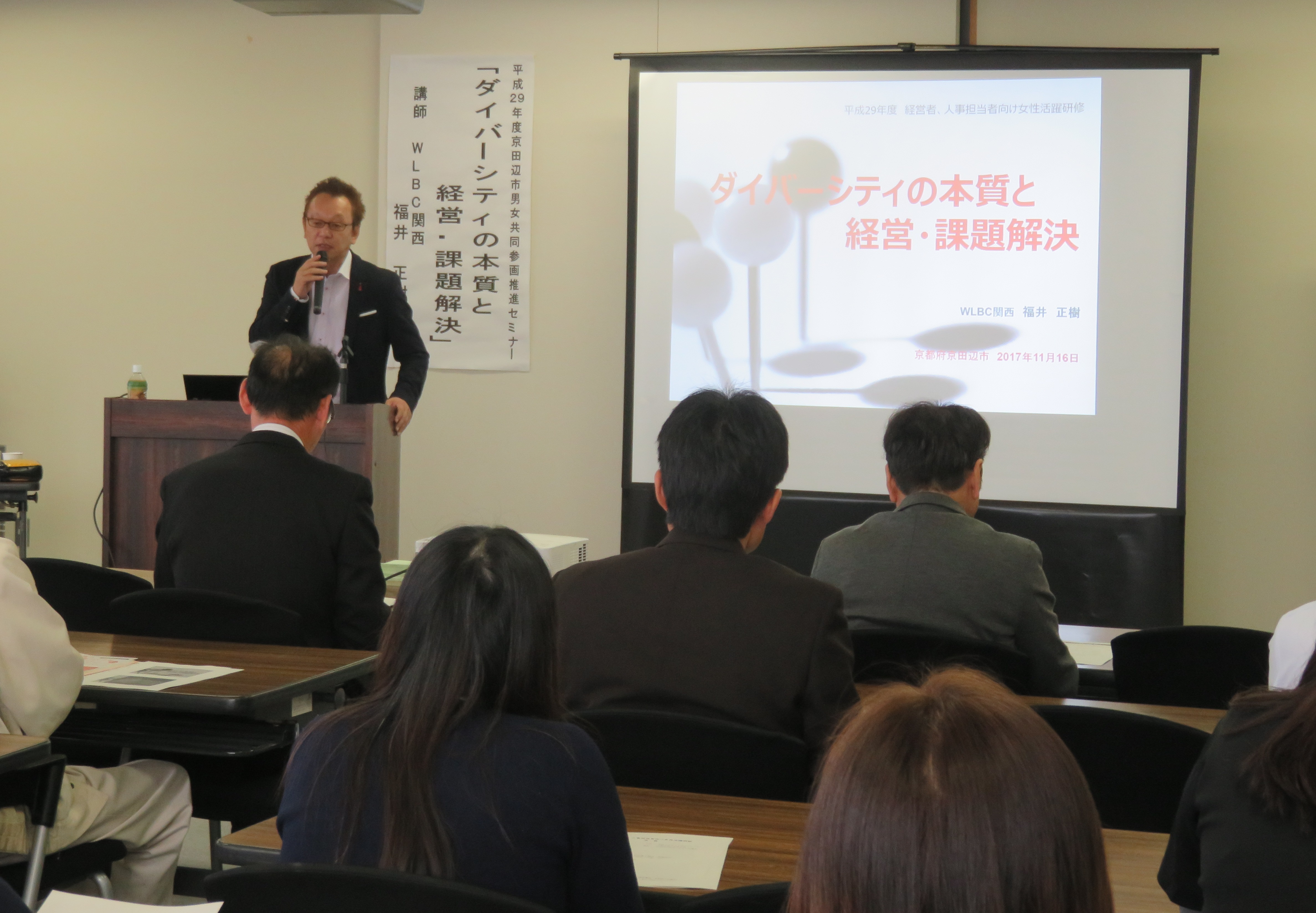 京田辺市と輝く女性応援京都会議(事務局:京都府・京都市・京都労働局・京都商工会議所)は、市内事業所や市民団体において男女共同参画の推進役として設置いただいている男女共同参画推進員および府内事業所の管理職・人事担当者等を対象に、各事業所等における男女共同参画の促進を目的として、女性活躍研修を開催しました。