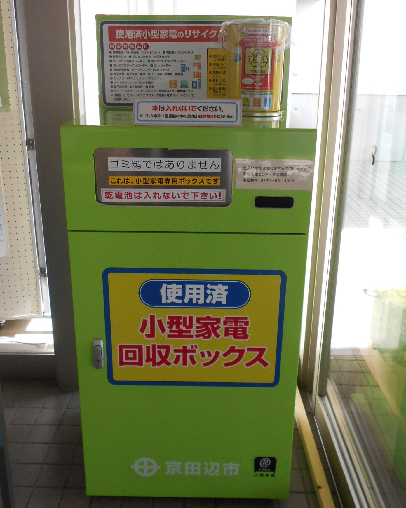 京田辺市では、この大切な資源をリサイクルするため、市施設に回収ボックスを設置し、使用済小型家電の回収を行っています。