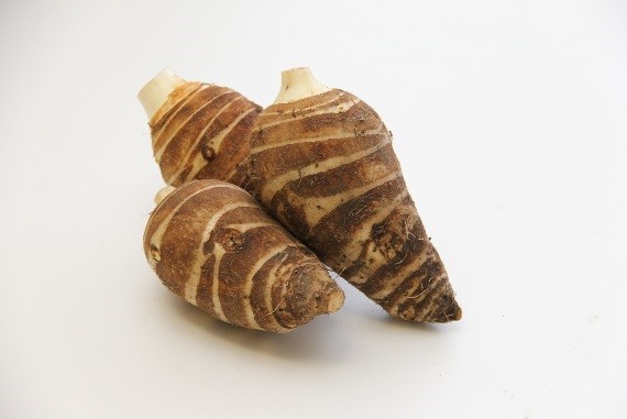 A type of taro, the Ebiimo (“shrimp potato”) is named after its shrimp-like appearance. This winter vegetable is in season from October to February and is a certified “Kyoto Brand Good”. It is typically used in winter seasonal dishes such as oden, stews and osechi-ryori(New Year's dishes). They are known for their sweet taste and unusual texture which is both glutinous and crisp.