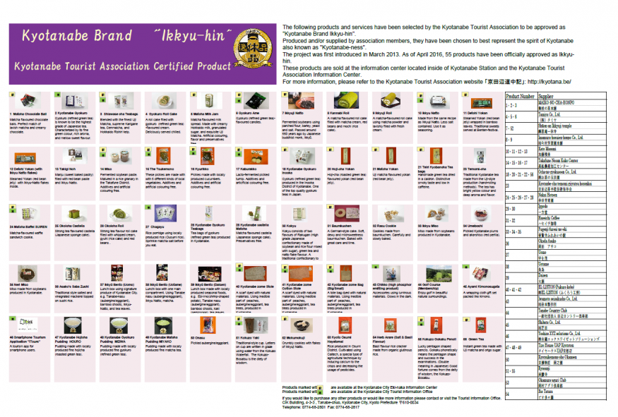 The following products and services have been selected by the Kyotanabe Tourist Association to be approved as "Kyotanabe Brand Ikkyu-hin". Produced and/or supplied by association members, they have been chosen as the best representatives of the spirit of Kyotanabe also known as "Kyotanabe-rashisa". The project was first introduced in March 2013. As of April 2024, 40 new products have been officially approved as "Ikkyu-hin". These products are sold at the information center located inside of Kyotanabe Station and the Kyotanabe Tourist Association Information Center.