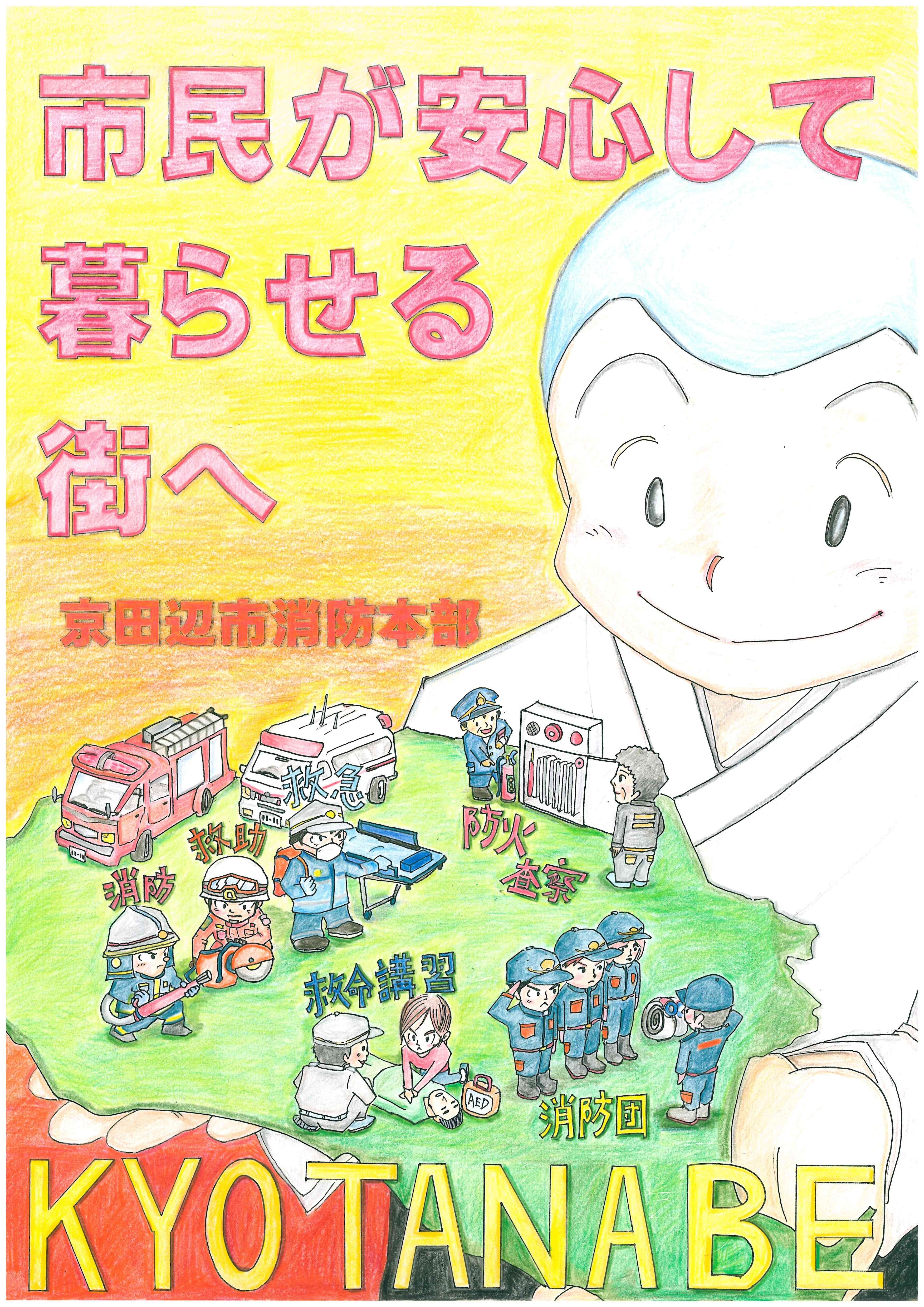 作者のコメント「絵が得意なこともあり、温もりのある色鉛筆で描きました。観光大使の一休さんが見守る中、まちを守る消防職員・消防団の業務を表情を見せながら分かりやすく伝えることにこだわりました」