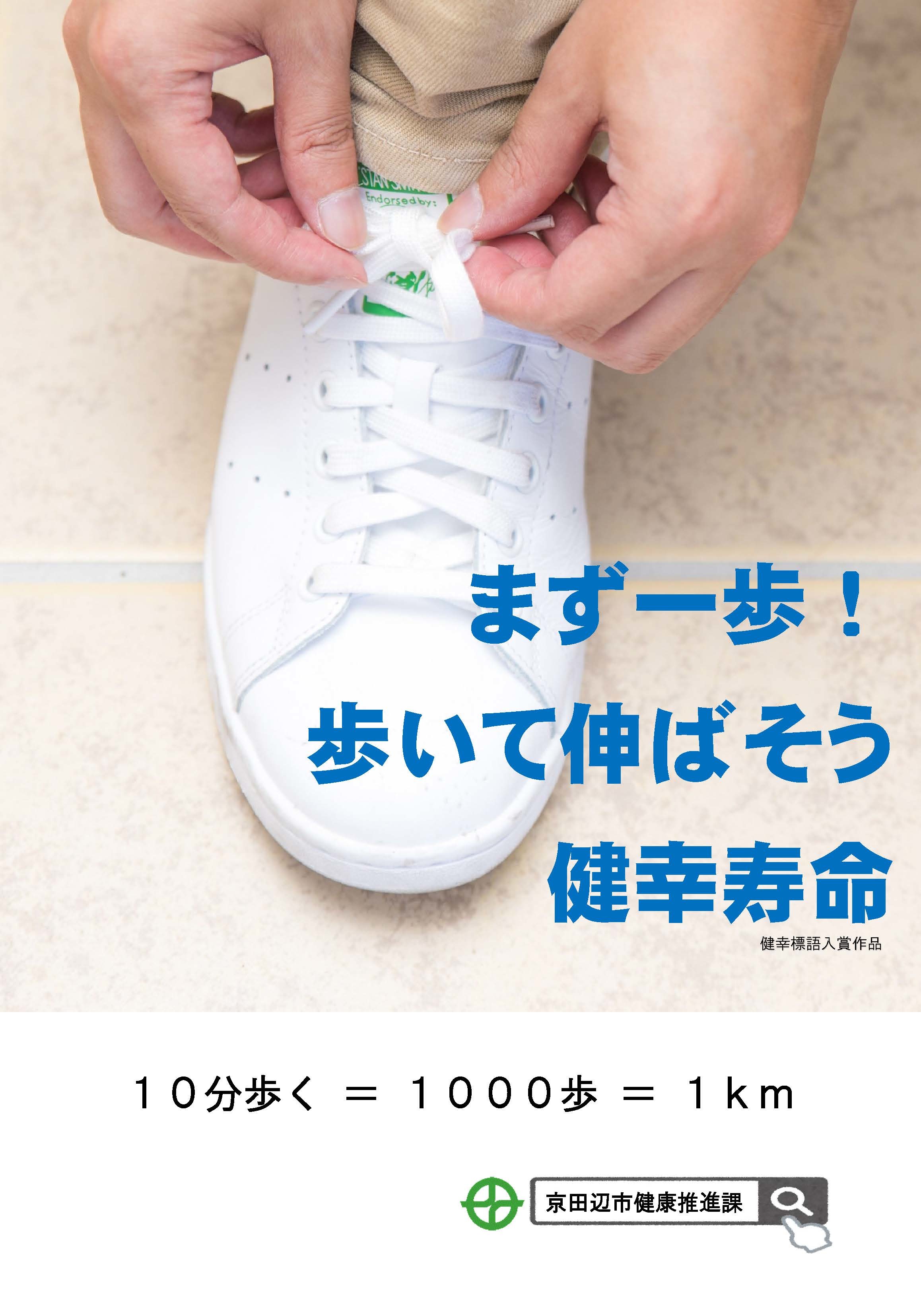 作者のコメント「市民公募で決定したばかりの健幸標語を前面にPRしながら、できるだけ文字数を減らし目を引く表現を心掛けました。標語にある『まず一歩!』は、靴を履くことから始まるので、そのイメージが伝わり、なおかつ明るさのある写真にこだわりました」