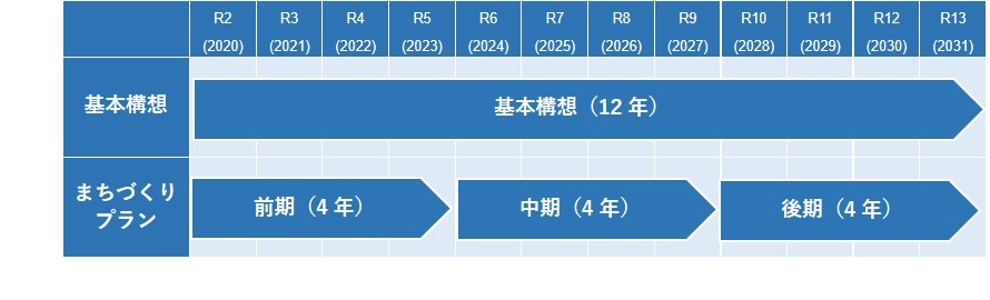 長期的なまちづくりの基本指針である基本構想の計画期間は、令和2年度(2020年度)から令和13年度(2031年度)までの12年間とします。