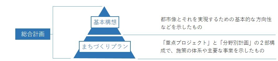 まちづくりプランは、基本構想に基づき、基本施策の体系や施策を実現するための主要な事業を示すものとして、「重点プロジェクト」と「分野別計画」の2部構成とし、市長マニフェストと連動したものとします。