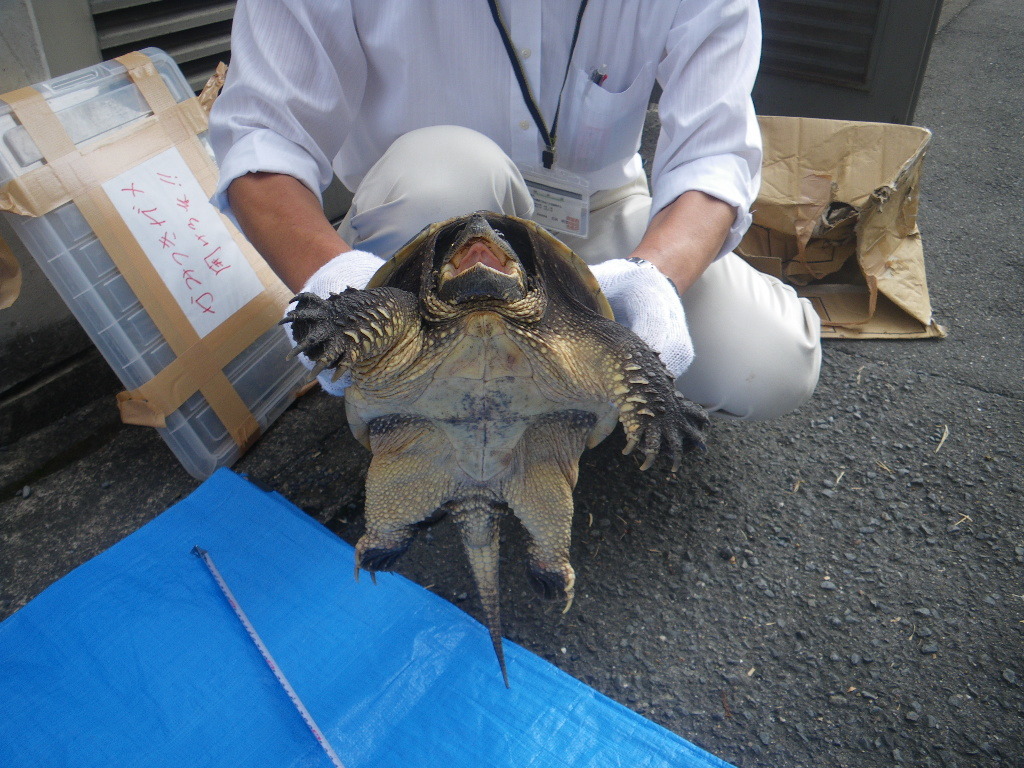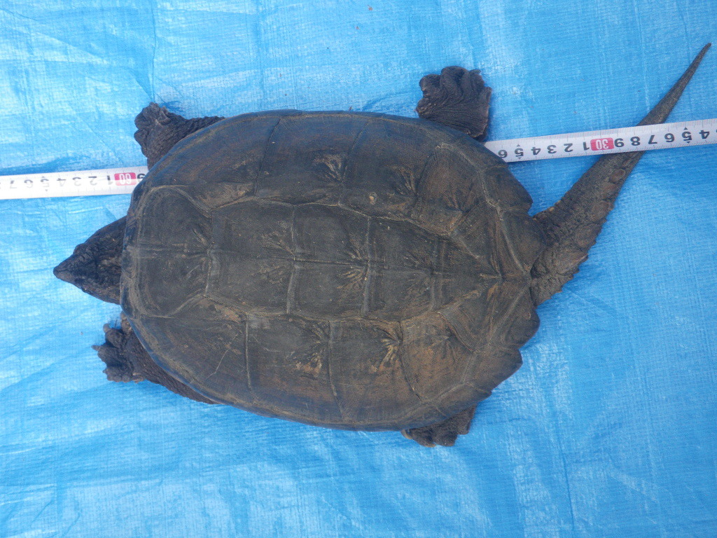 平成30年9月15日(土)に草内地区(防賀川)で、特定外来生物「カミツキガメ」が発見され、市で捕獲しました。