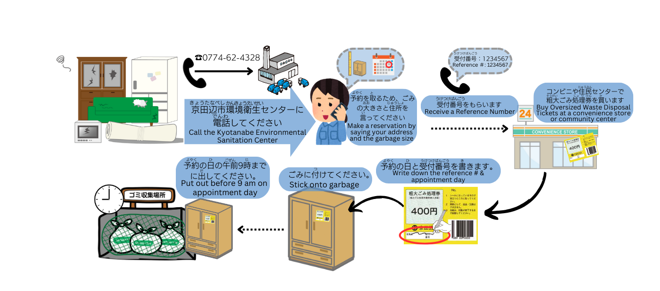- Make a pickup appointment by calling the Environmental Sanitation Center. Phone: 0774-62-4328 Hours: Monday through Friday (including public holidays) from 8 : 30 am to 5 : 15 pm. If it is too difficult to make a call, either contact them using this form or send a fax(0774-62-2163). When making your appointment, state your address and the size/type of garbage. You will be given a reference number.