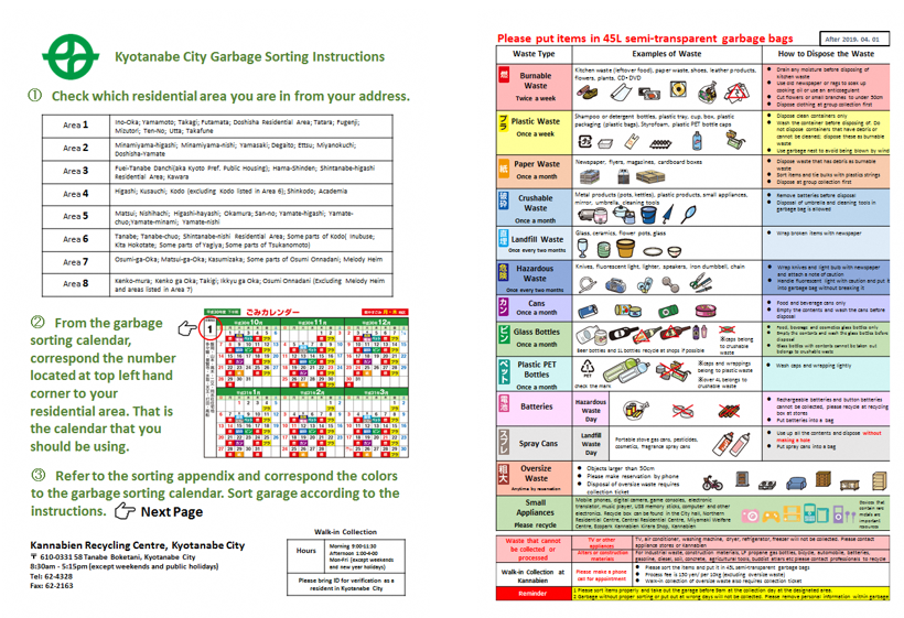 For foreigners moving in and living in Kyotanabe City, please refer to the Kyotanabe City Garbage Sorting Instructions in English and Chinese, when you dispose garbage.