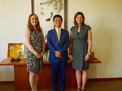 5月22日(水)、日本の高校にPR活動を行うために来日しているアメリカバーモント州キャスルトン大学のカレン スコルフォロ学長とエリカ メイシア アドミッションズオフィスディレクターが市役所を訪れ、上村市長と懇談しました。