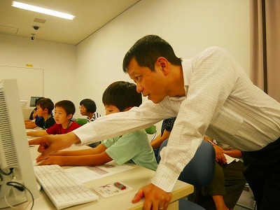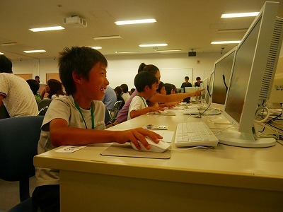午前中の「コンピュータプログラミングでゲームを作ってみよう」では、初心者でも簡単な操作でプログラミングができる「Scratch」を使ってコンピュータ上でゲームを作り、最初は戸惑っていた子ども達も、徐々に要領をつかんだようで、自分の思ったとおりの動きが出来た時には目を輝かせていました。また、プログラミングでは、上村市長も激励に来られ、参加者にアドバイスされる場面もありました。