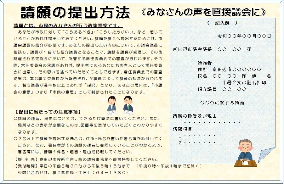 市民のみなさんが、市政などについて直接市議会に要望できる制度があります。これを「請願」といいます。提出された請願は、それぞれの常任委員会に付託され慎重に審議されます。