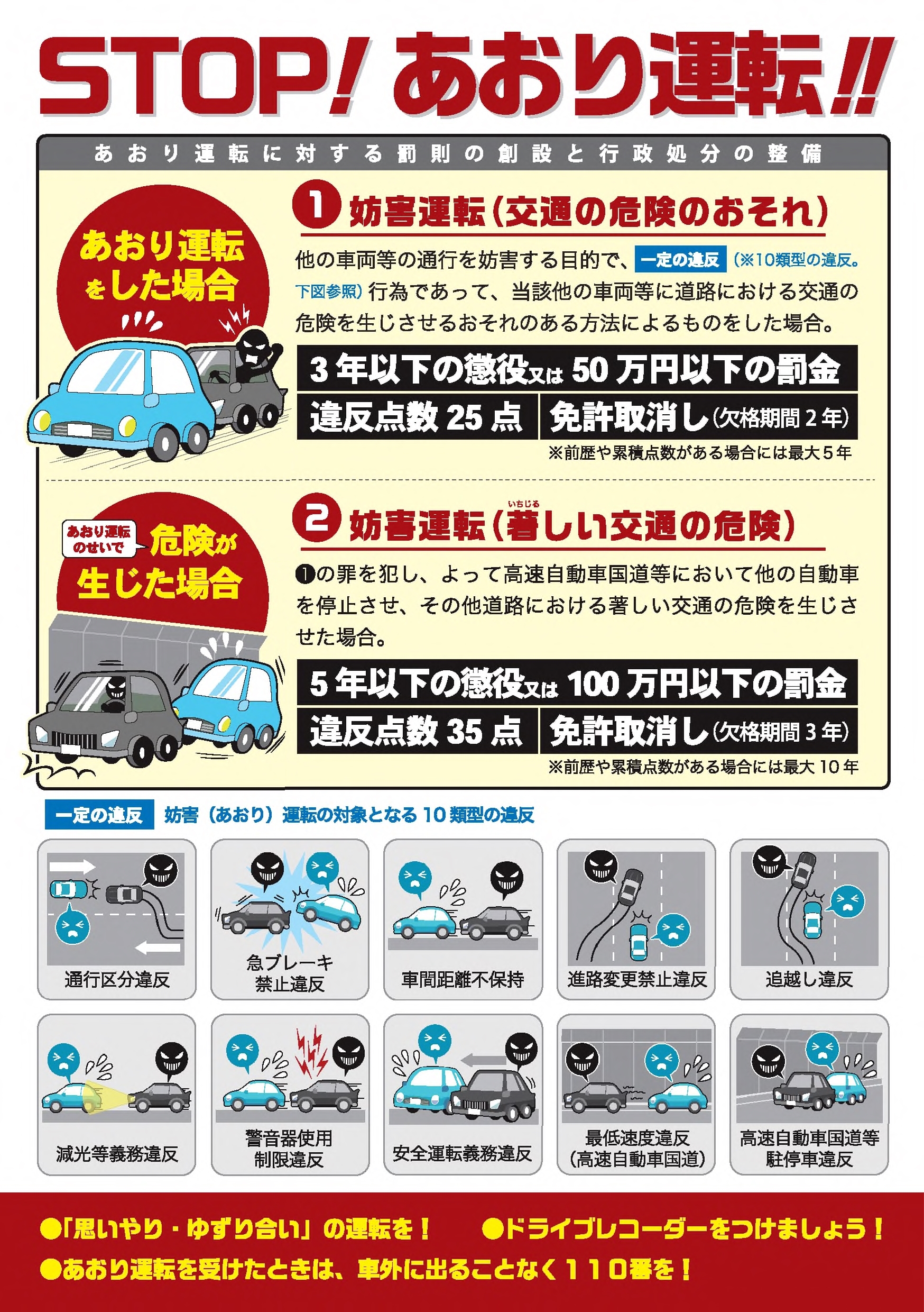 「あおり運転」(妨害運転)は、重大な交通事故につながる極めて悪質・危険な行為です。 車を運転する際は、周りの車等に対する「思いやり・ゆずり合い」の気持ちを持って、安全な速度・方法での運転を心掛け、十分な車間距離を保つとともに、不必要な急ブレーキや無理な進路変更等は絶対にやめましょう。