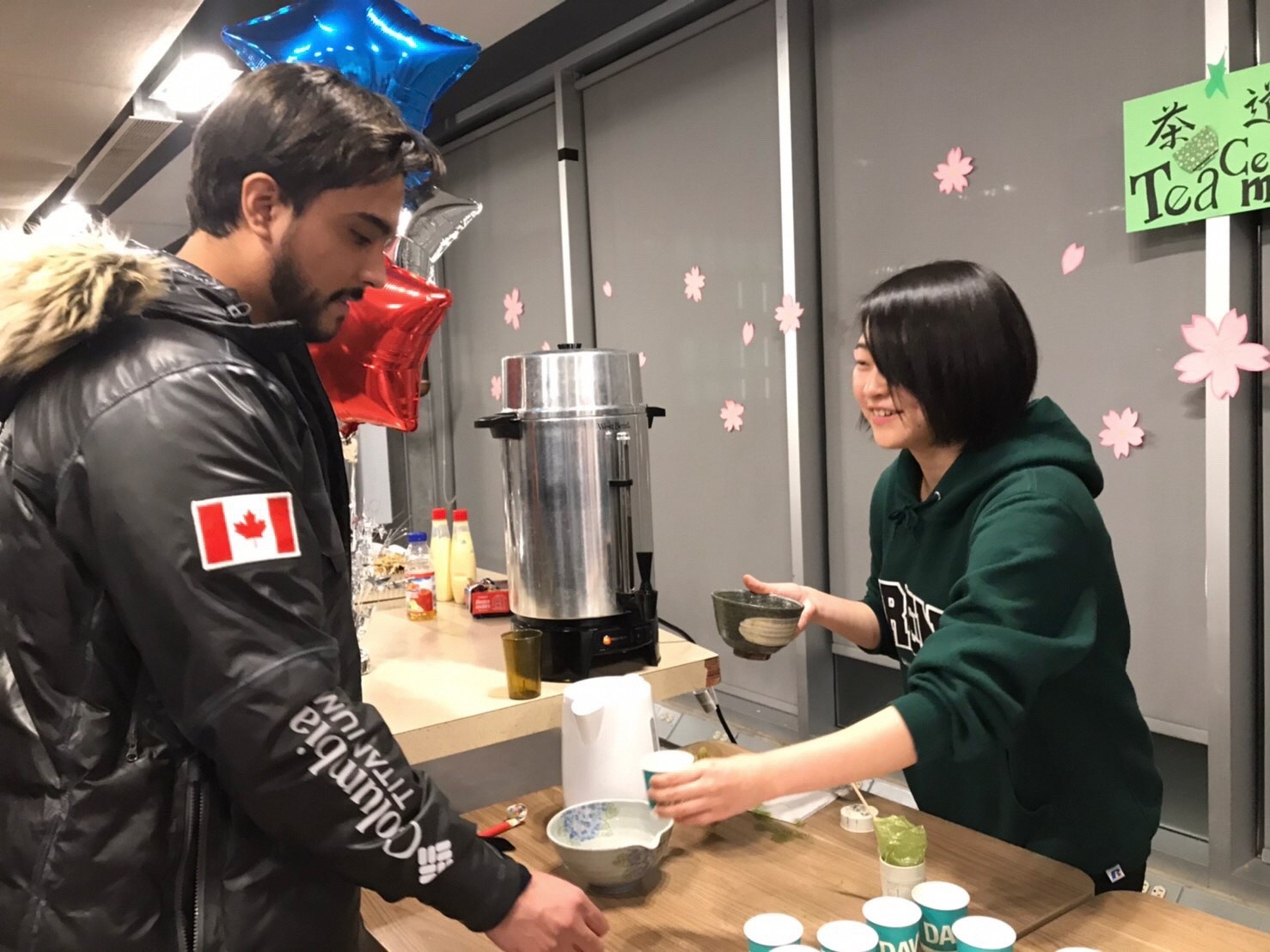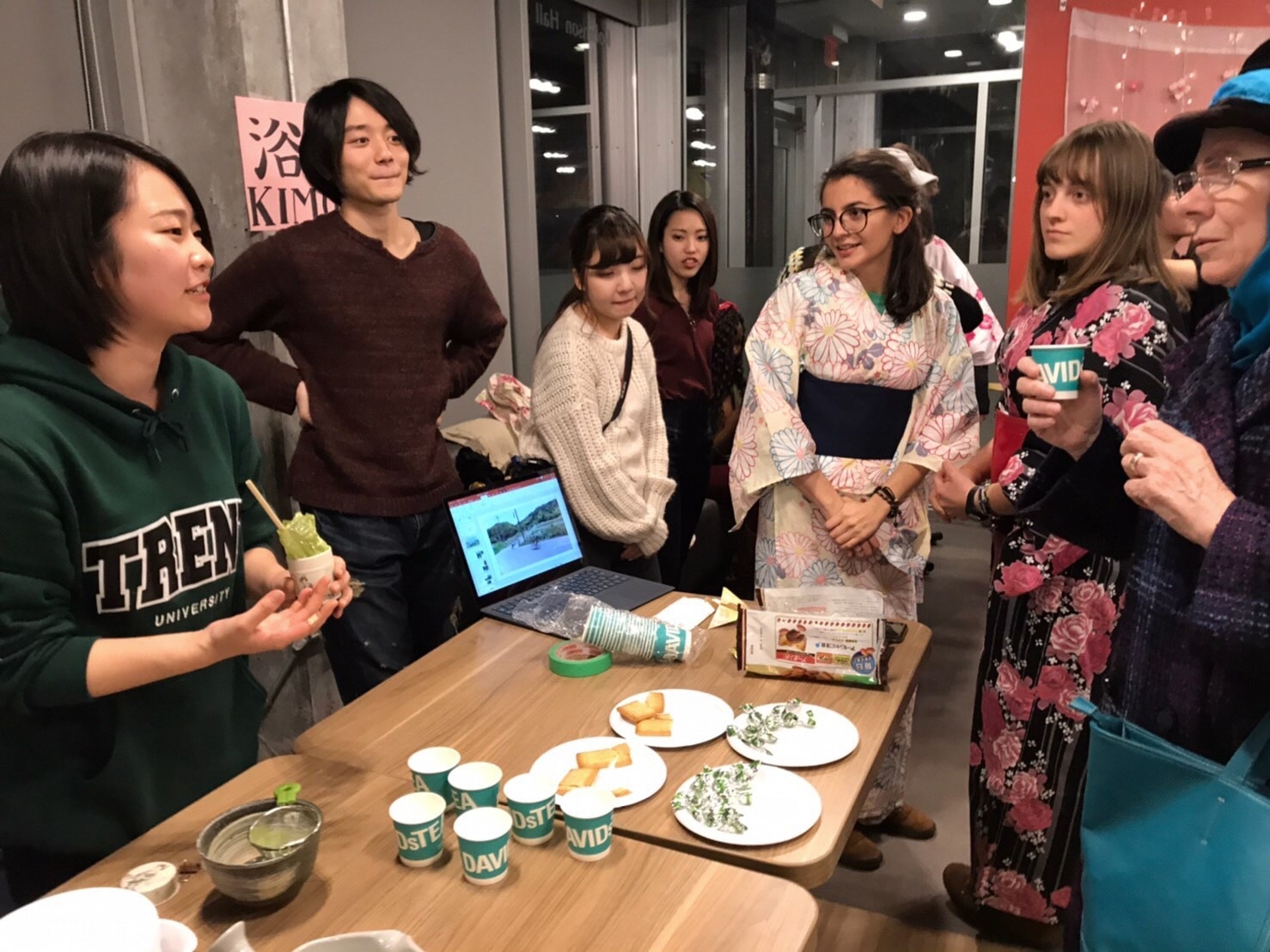 カナダでは日本のように緑茶のティーパックがスーパーで売られているほどお茶は親しまれていますが、抹茶で作ったお茶はあまり見たことがないという学生がほとんどでした。約50名ほどの学生にお茶を振舞いましたが、京田辺産の抹茶の豊かな香りと濃厚な味に「今までに飲んだことのないお茶だ!」と感動している方が多く見受けられました。京田辺市のPR動画を用いて京田辺市について紹介しましたが、まだまだ日本の地理(特に東京、大阪、京都などの有名な都市の位置)や特産品などの文化に対する知名度が低いと感じました。