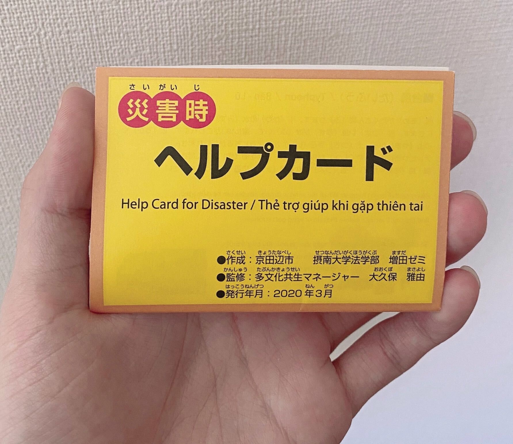 京田辺市は、日本語を話すことができない外国人向けに、災害時に意思疎通できるように『災害時外国人ヘルプカード』を作成しました。