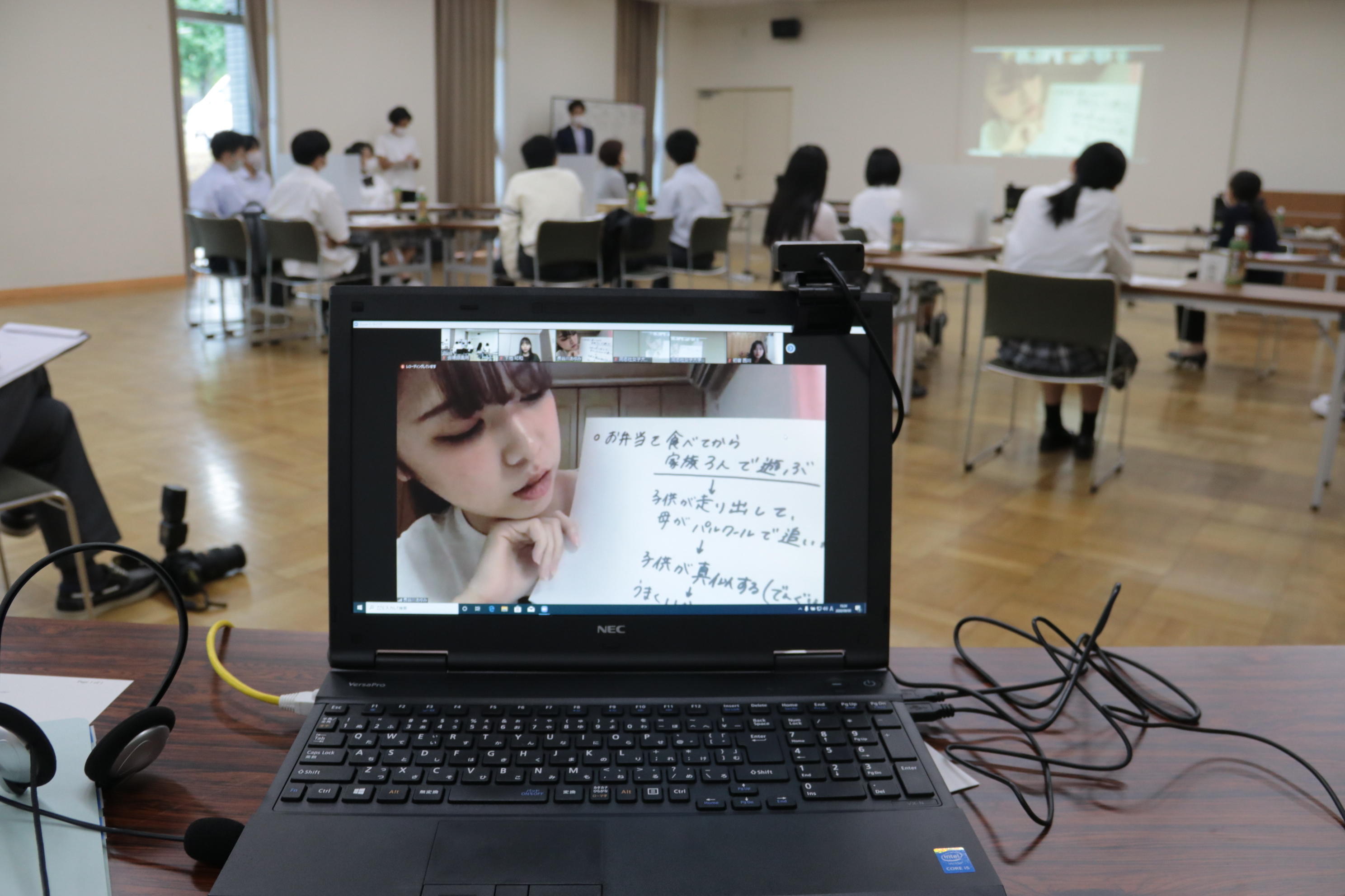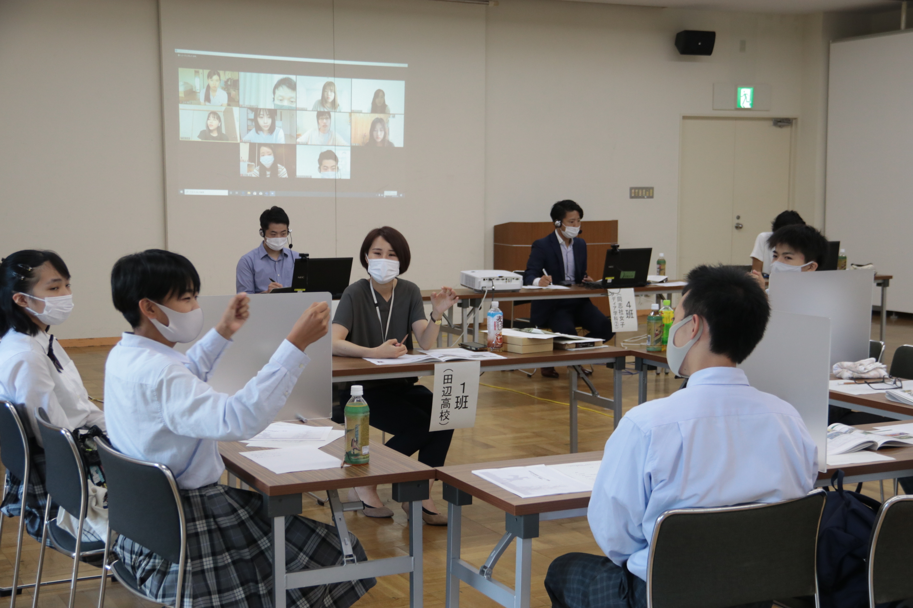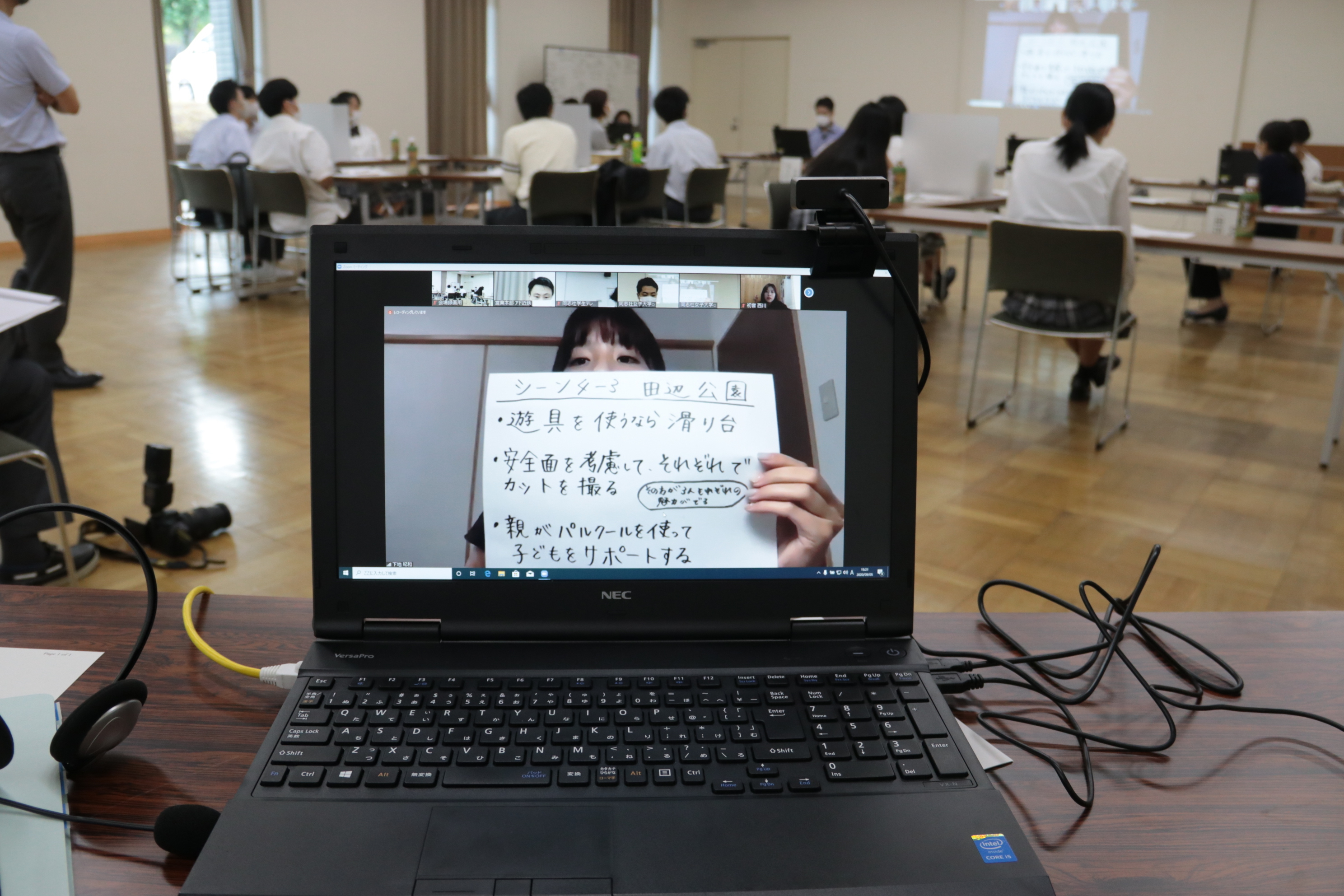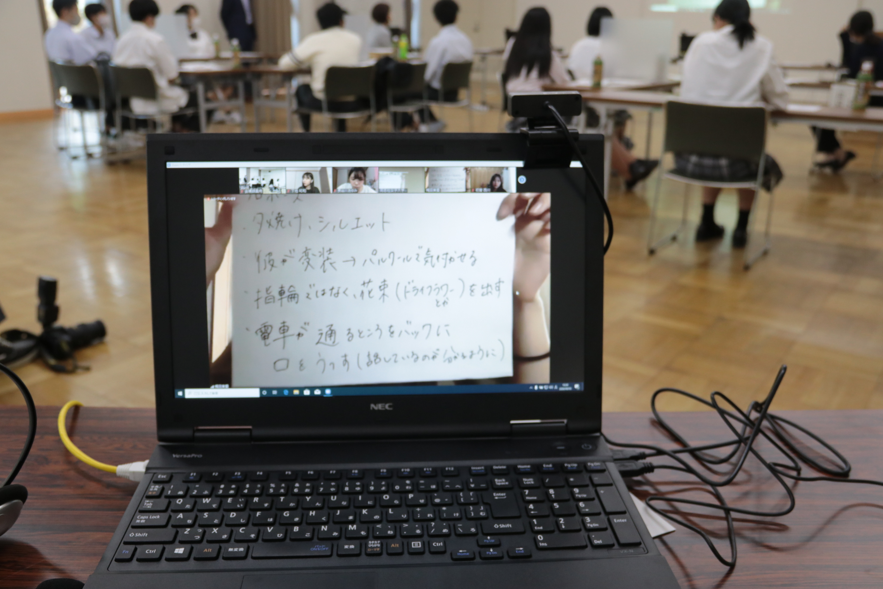 ワークショップでは、会場に集まった田辺高校生11名と、オンライン会議システムを通じて参加した同志社・同志社女子大学生19名が5グループに分かれ、動画のタイトルやシチュエーションについて話し合い、意見発表を行いました。