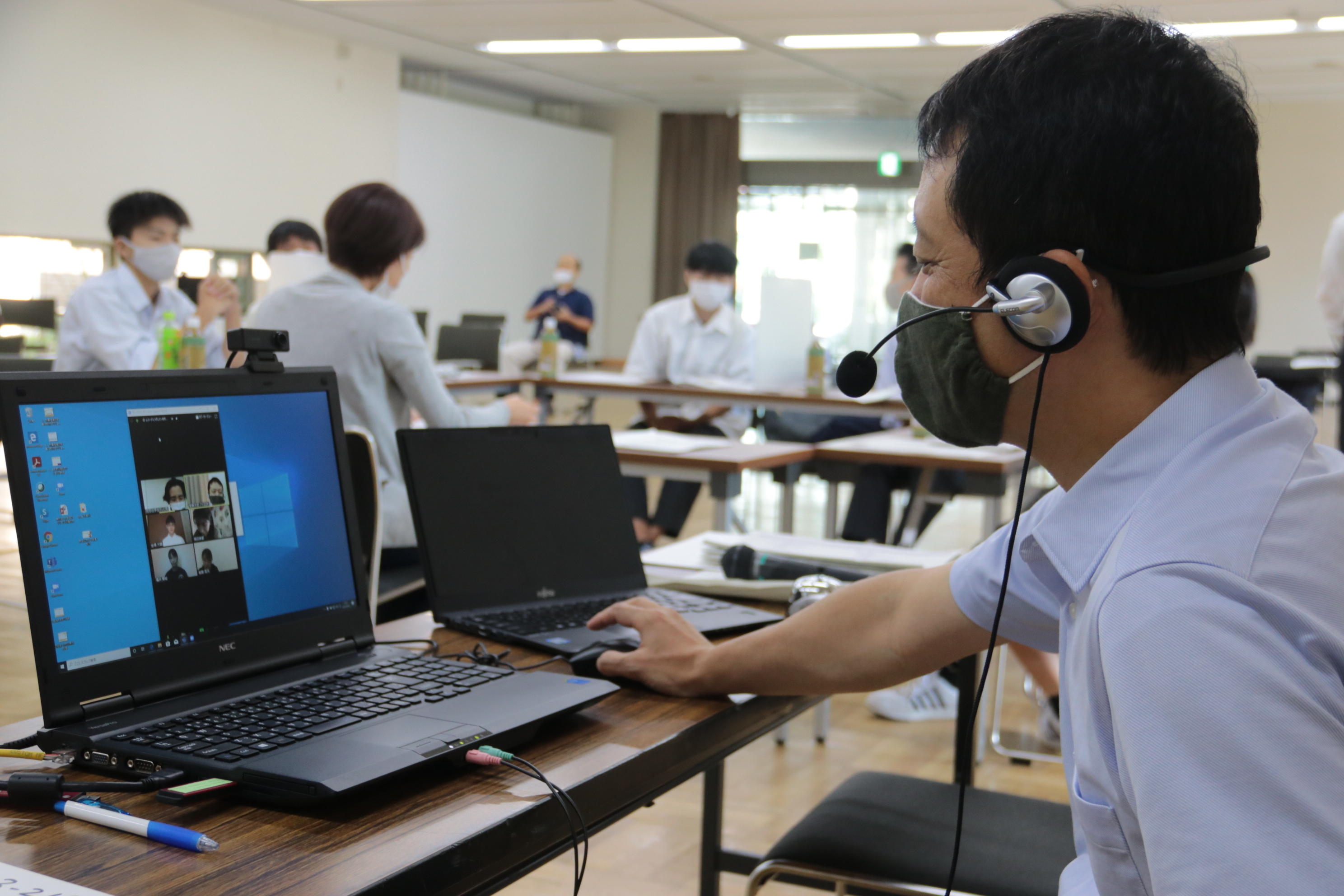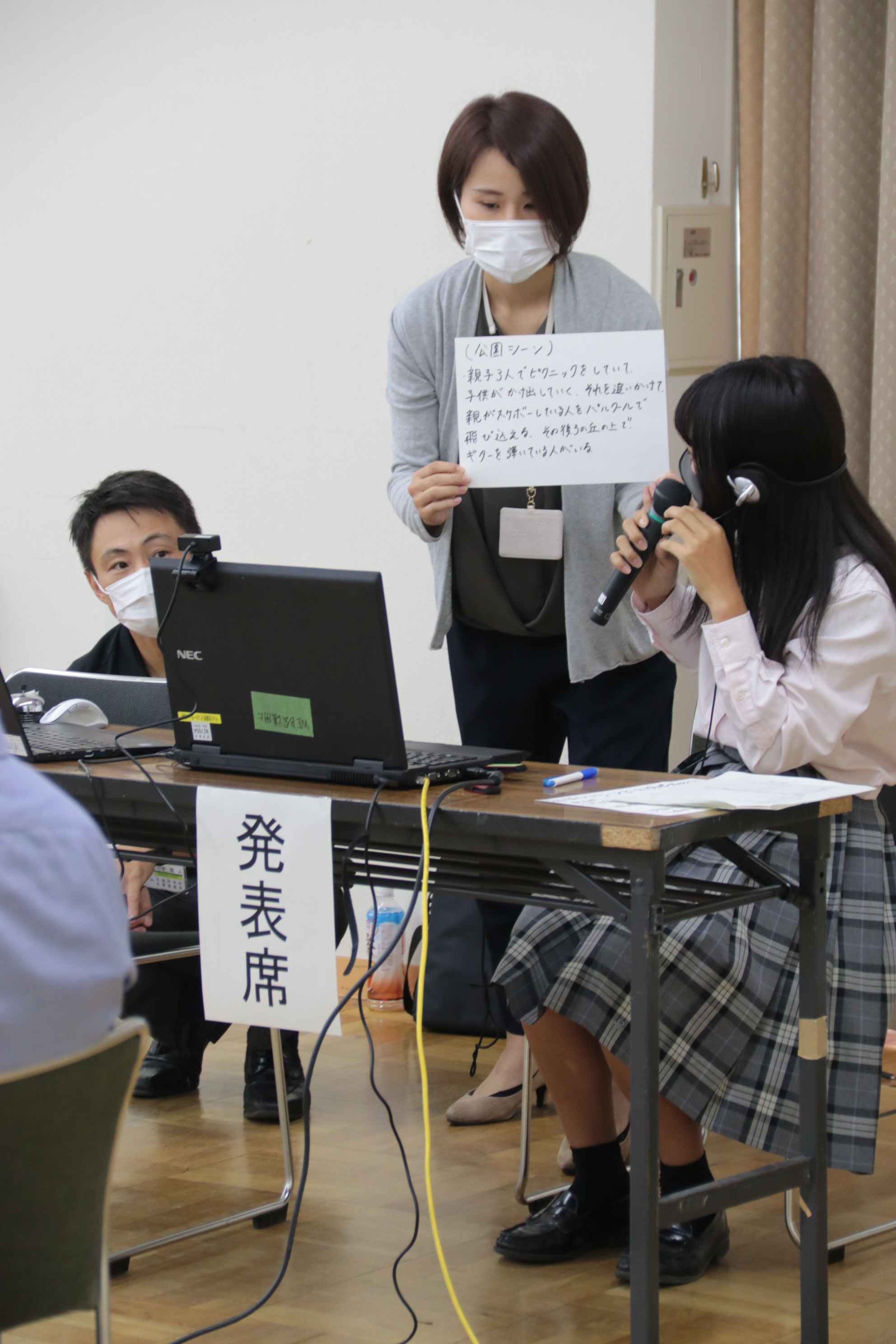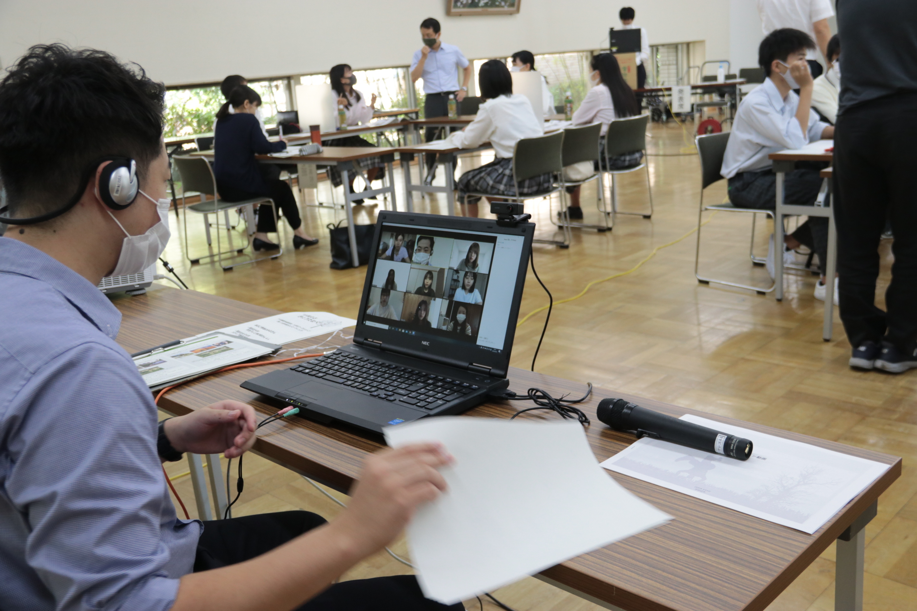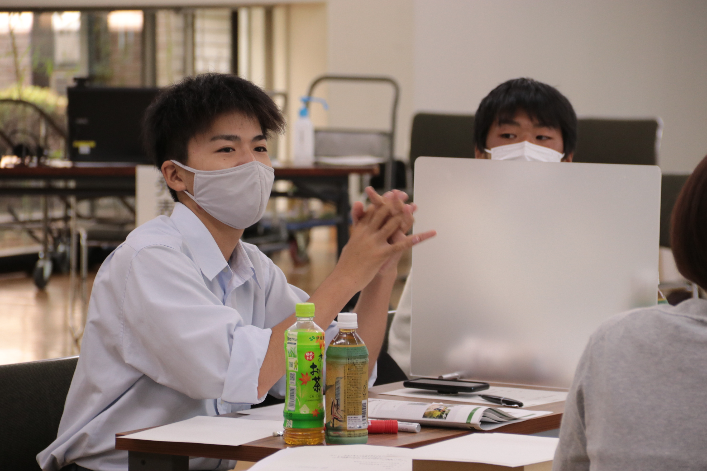 ワークショップでは、会場に集まった田辺高校生11名と、オンライン会議システムを通じて参加した同志社・同志社女子大学生19名が5グループに分かれ、動画のタイトルやシチュエーションについて話し合い、意見発表を行いました。