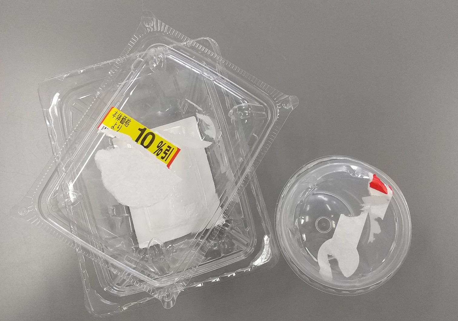 水でさっと洗うなどして、プラスチック容器包装でお出しください。