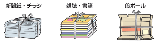 新聞紙・チラシ、雑誌・書籍、段ボールなど、区分ごとにしばってお出しください。細かい雑紙は、紙製の空き箱に入れたり、冊子等の間に挟むと出しやすくなります。