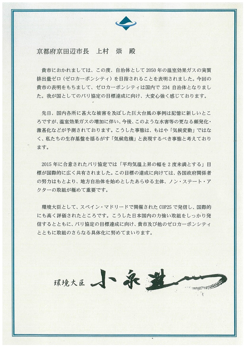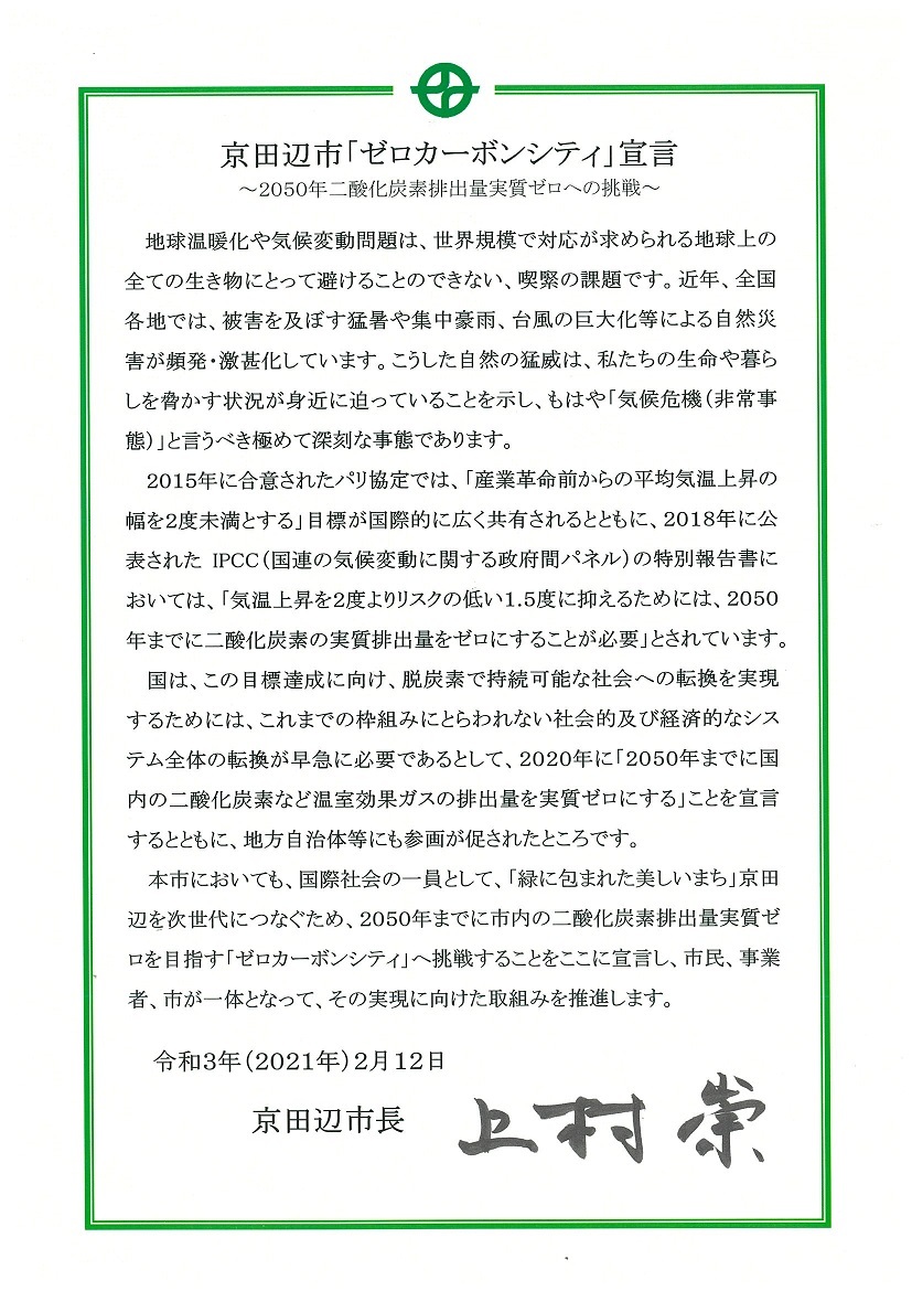 京田辺市は「ゼロカーボンシティ」へ挑戦することを宣言しました。