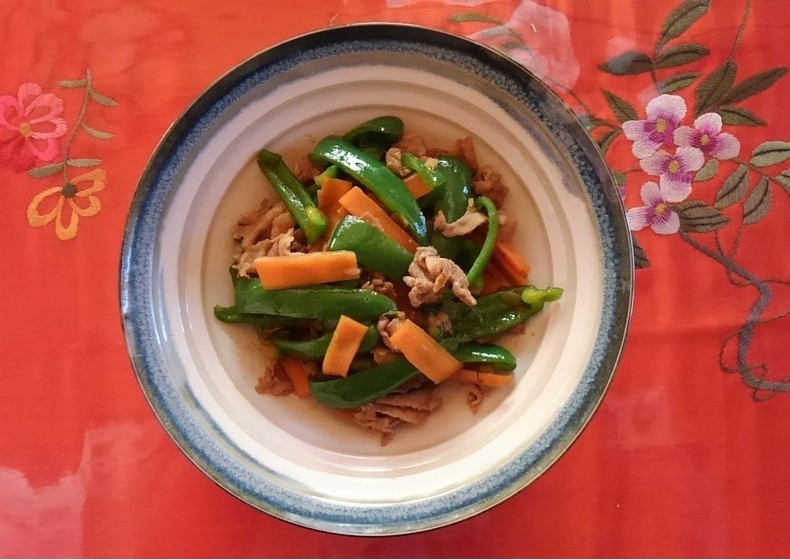 - フライパンに油をひいて、中火でしょうが、ねぎを炒め、香りがでたら強火にして、豚肉、人参を加え、最後にピーマンを入れて炒める。