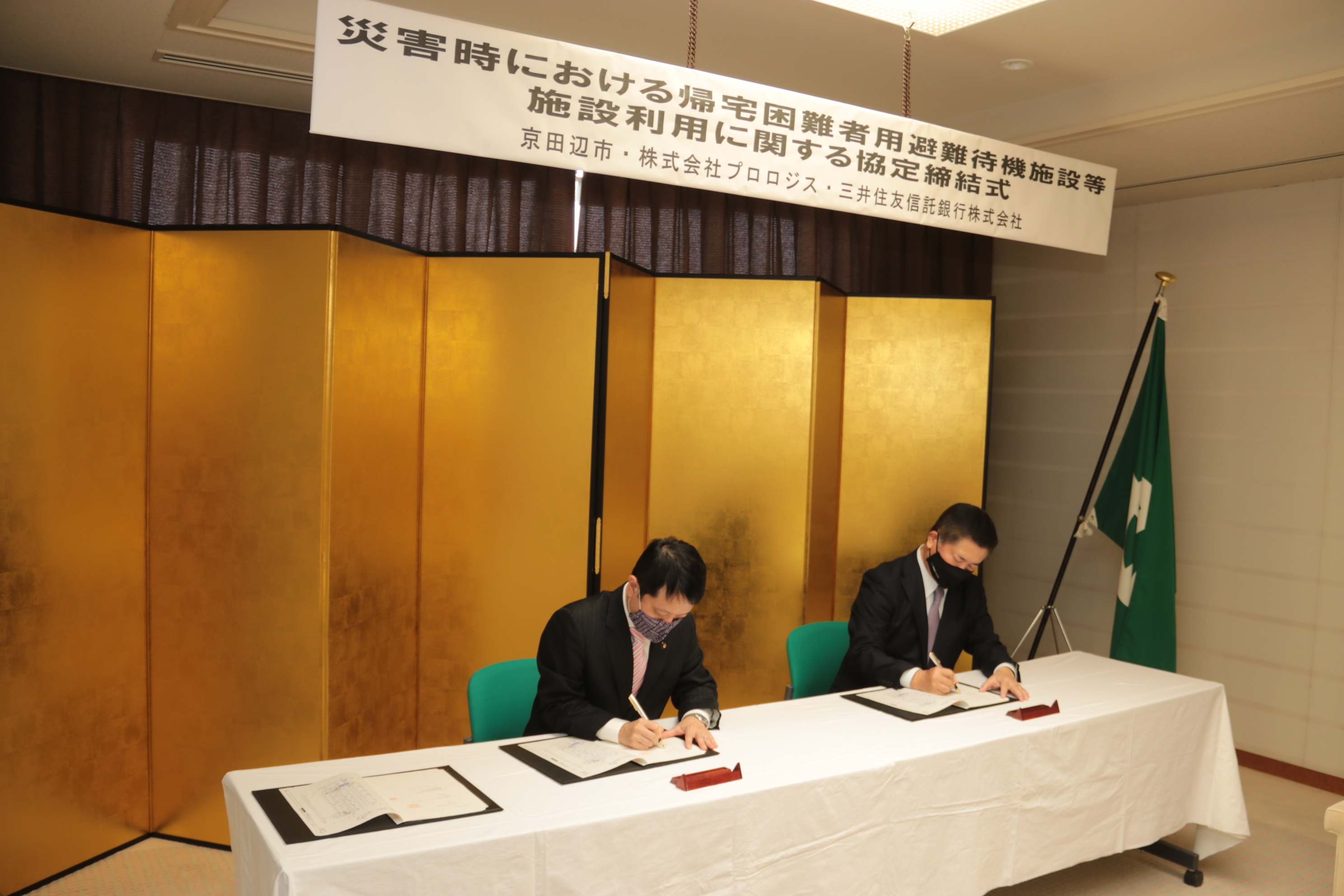 令和3年3月26日(金)、京田辺市は、株式会社プロロジスおよび三井住友信託銀行株式会社と「災害時における帰宅困難者用避難待機移設等施設利用関する協定」を締結しました。