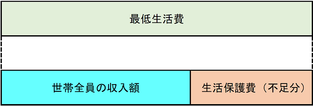 図1のように、最低生活費に対し、世帯全員の収入額が少ない場合には、不足分が保護費として支給されます。