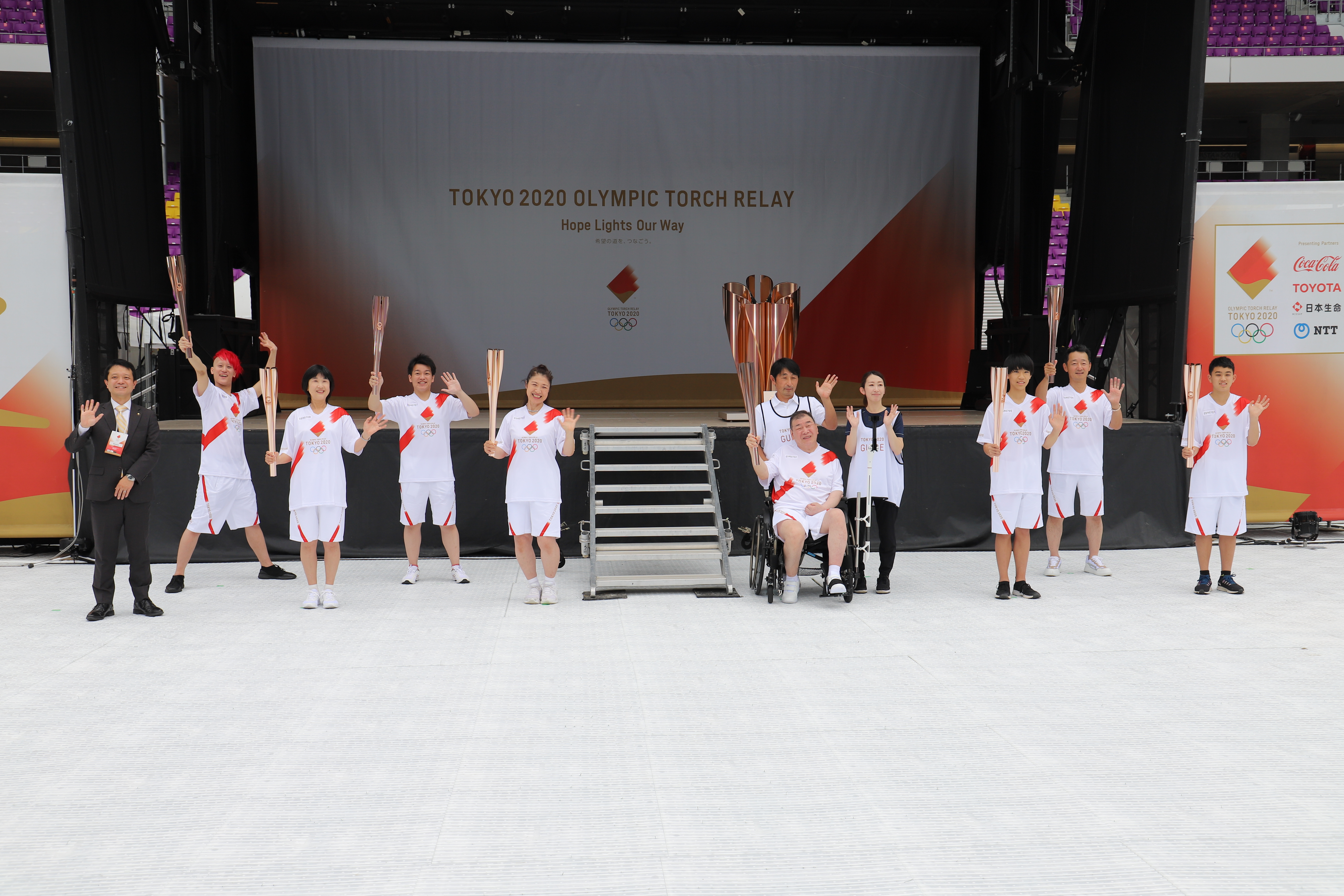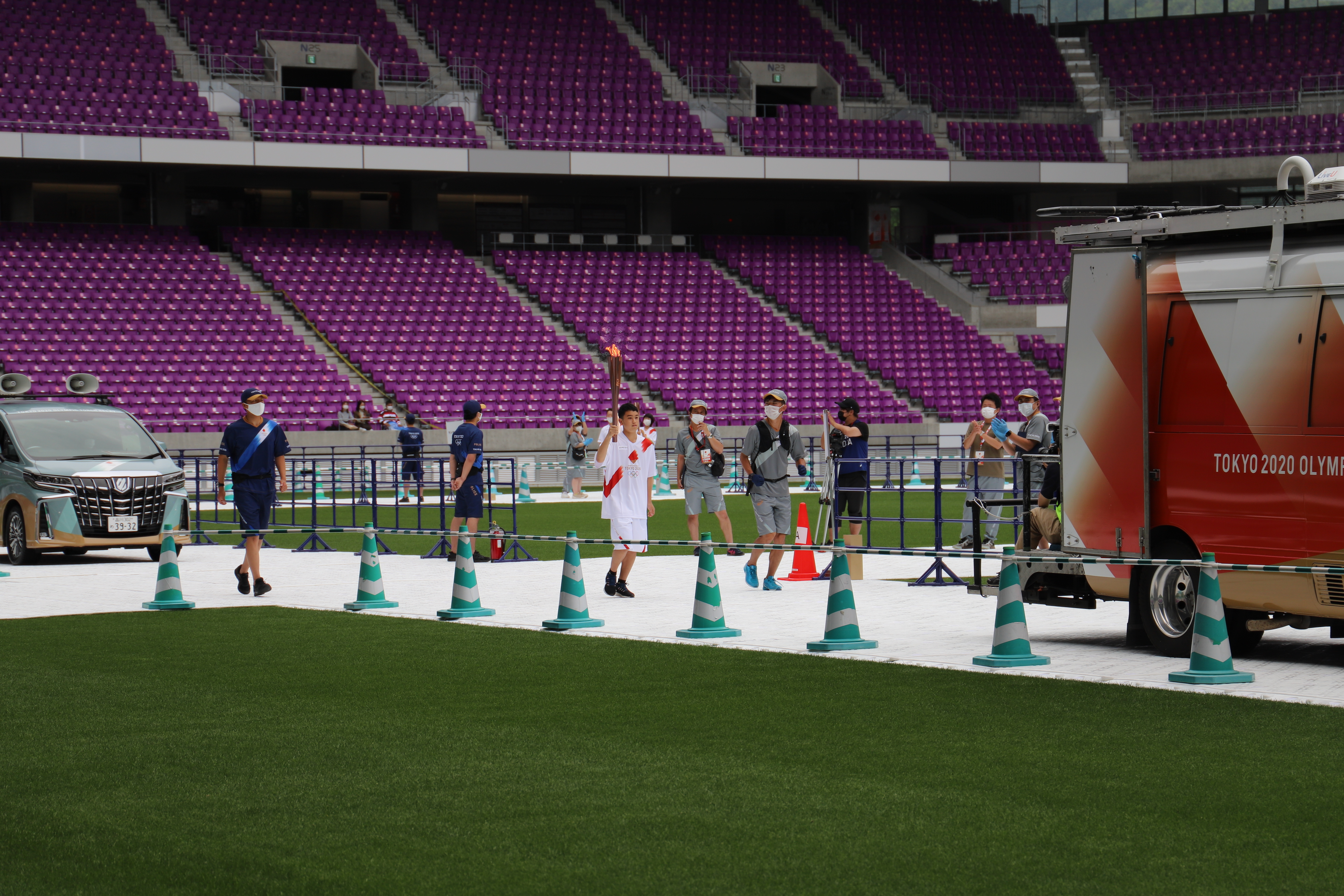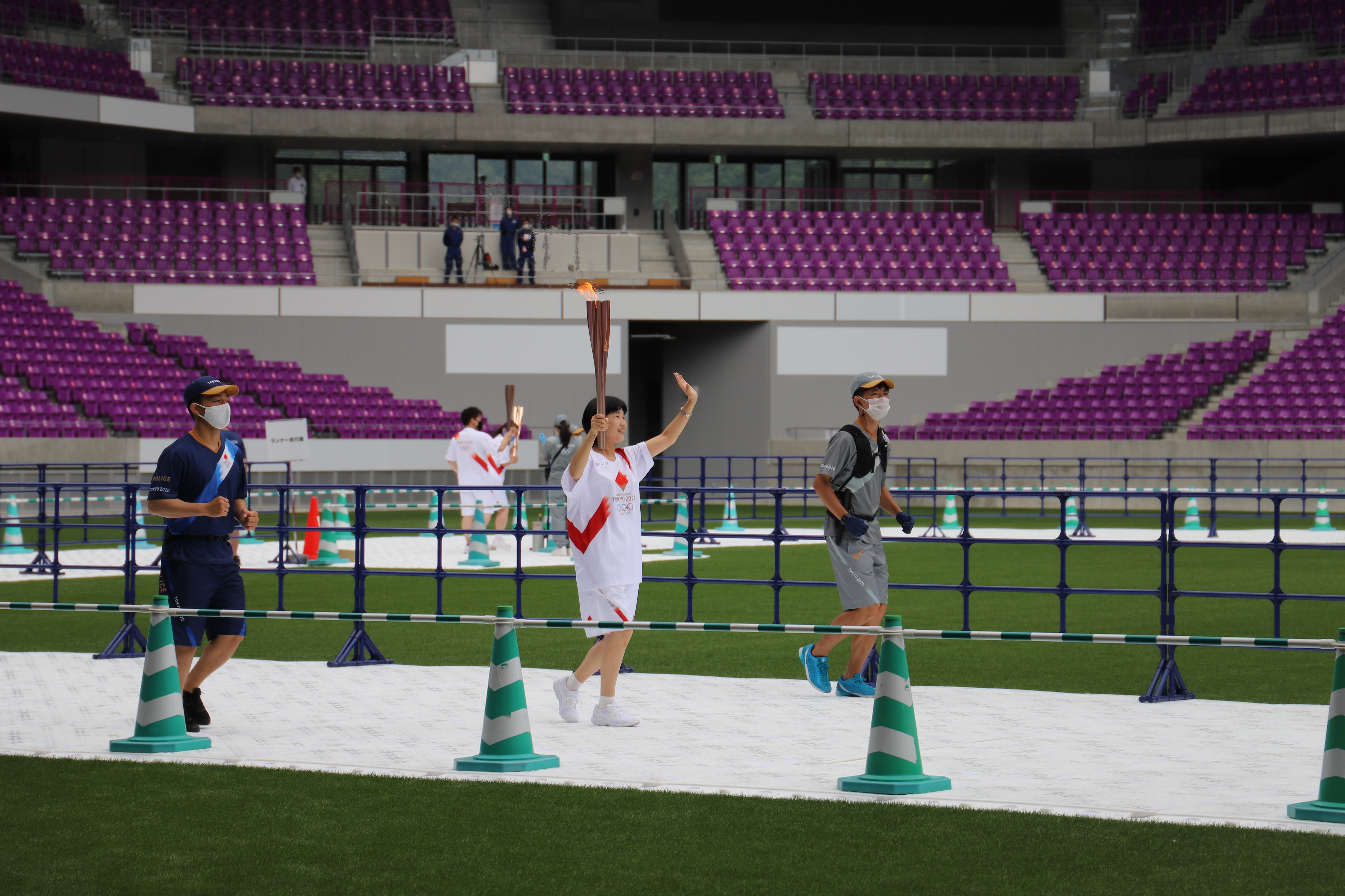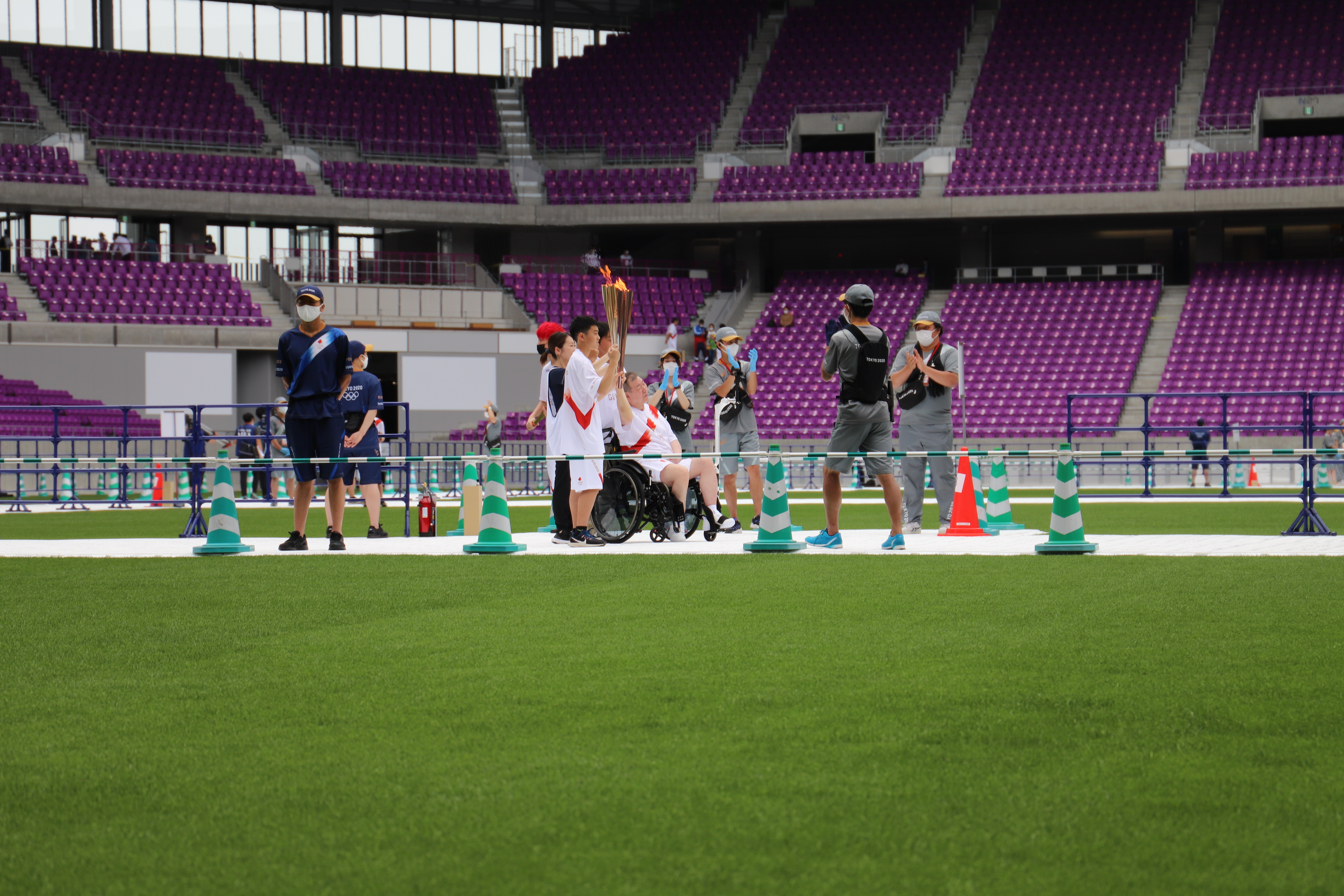 そのため、5月26 日(水)に京田辺市内で予定しておりました聖火リレーは中止となりましたが、公道での実施に代えて、セレブレーション会場「京都府立京都スタジアム」にて、無観客でリレーと点火セレモニーが行われました。